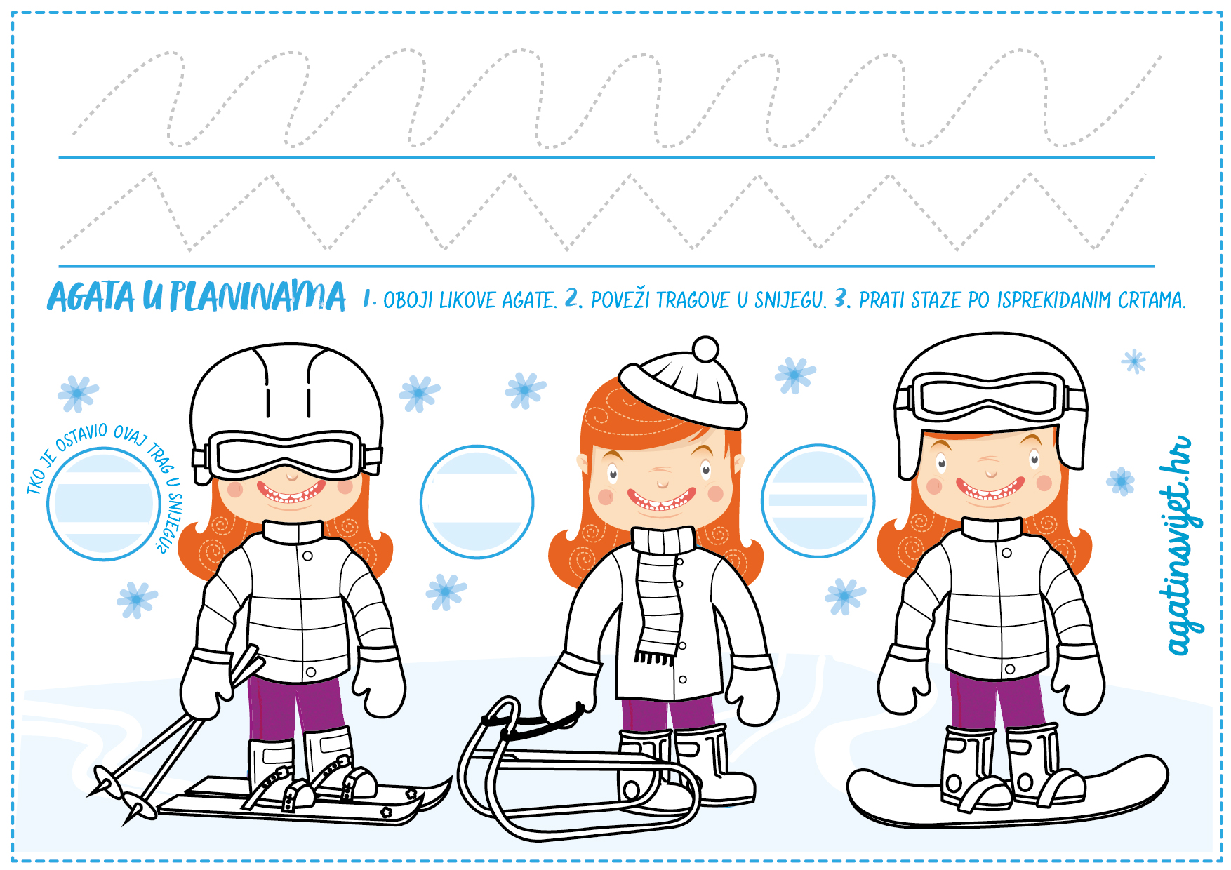 Preuzmite Agatu u planinama i riješite sve zadatke koje krije ova kartica! Kroz različite aktivnosti djeca će opustiti zapešća, uključiti moždane vijuge i uvježbati svoje grafomotoričke vještine. Koje će boje biti Agatina zimska jakna?