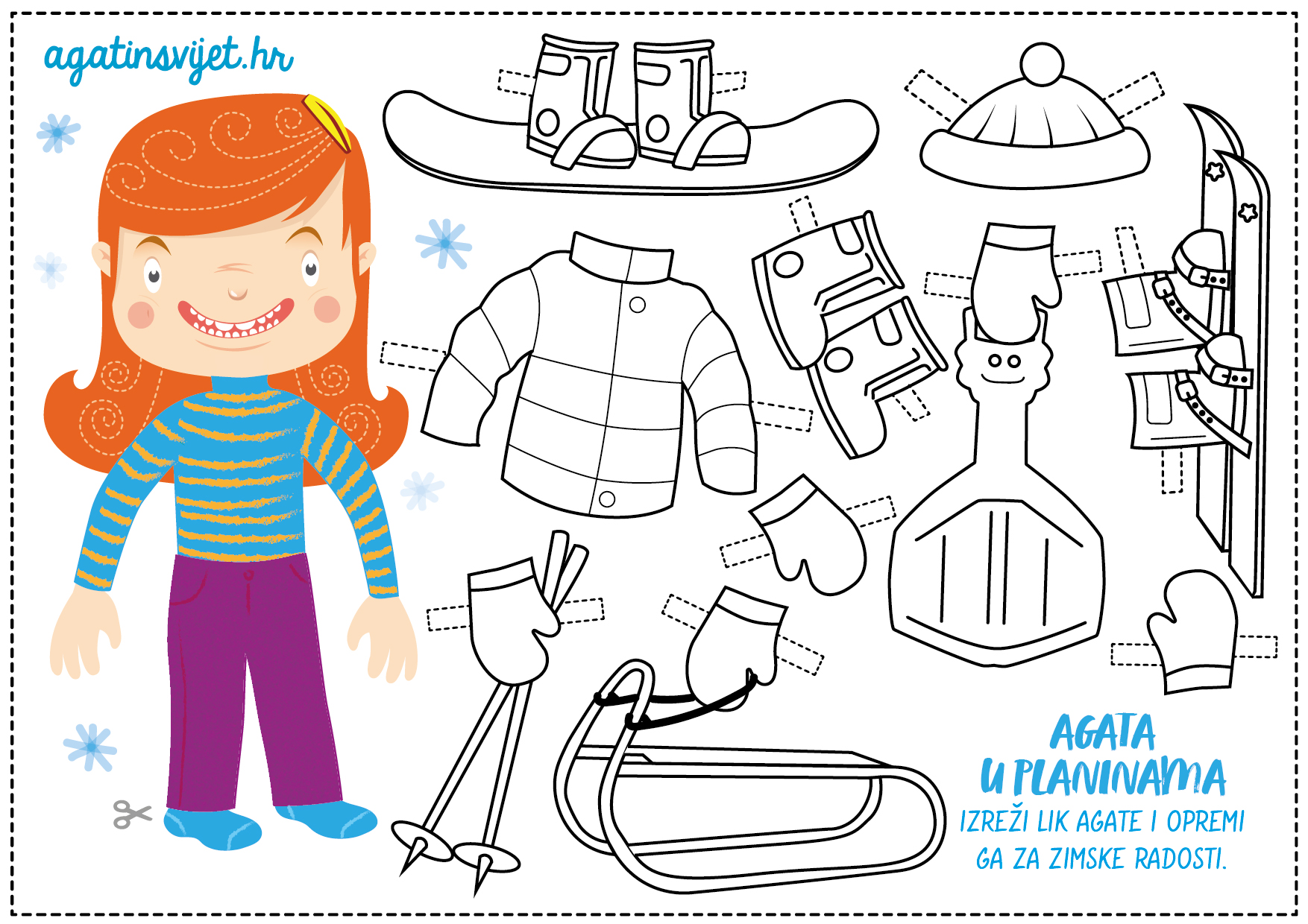 Volite li zimu i snijeg te redovito krećete u osvajanje snježnih padina? Ili radije uživate u zimi zamotani u dekicu s toplim kakaom u ruci? Kako god provodite zimske dane, sigurni smo da će vam izrezanka s Agatom u planinama uljepšati vrijeme. Koja će Agatica biti vaša favoritkinja? Agata na skijama, na lopati, na snowboardu ili na sanjkama? Preuzmite besplatno i zabavite se!
